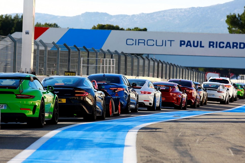 Sobald man aus der Boxengasse auf die Rennstrecke fährt, überfährt man NIE die weisse Linie die sich auf der Strecke am Ausgang der Boxengasse befindet ! Man folgt dem Rand der Strecke, beschleunigt schnell, um seinen Rhythmus und den der anderen Fahrer zu nehmen, und begibt sich dann langsam auf die ideale Linie. In Dijon-Prenois beispielsweise (Foto unten) erreichen die leistungsstärksten GT-Fahrzeuge am Ende der Geraden Geschwindigkeiten von 250 bis 300 km/h, genau dort, wo man auf die Strecke fährt…