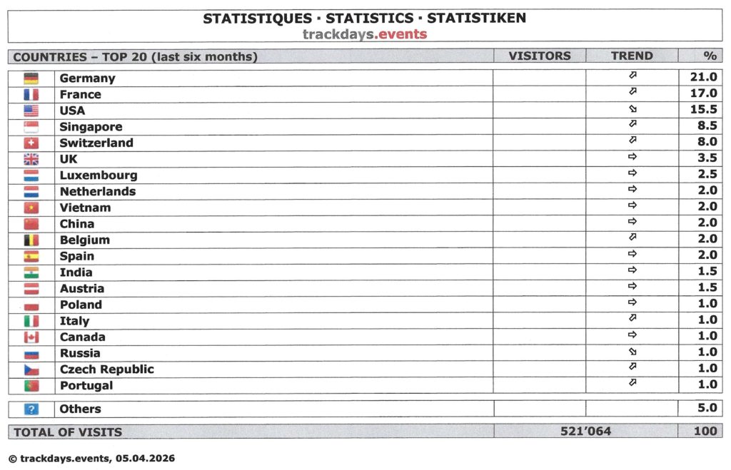 L’Allemagne reste sur la première place du podium. La France remonte au deuxième rang alors que les USA pointent en troisième place. Nous notons avec plaisir l’arrivée de nouveaux pays dans le TOP 20, à savoir la Tchéquie et le Portugal qui prennent respectivement les places de la Turquie et du Japon, qui ne sont pas très loin derrière. Nous sommes ravis de la portée internationale et, surtout, transcontinentale de notre site, car elle correspond parfaitement à nos objectifs initiaux.